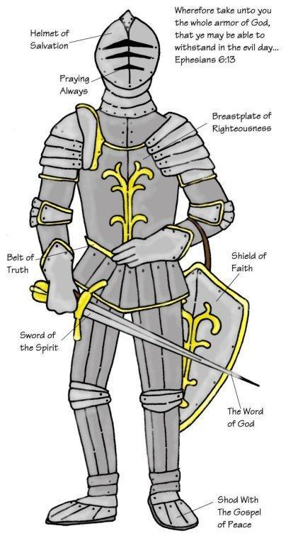 Ephesians 6:13-18:Wherefore take unto you the whole armour of God, that ye may be able to withstand in the evil day, and having done all, to stand. Stand therefore, having your loins girt about with truth, and having on the breastplate of righteousness; And your feet shod with the preparation of the gospel of peace; Above all, taking the shield of faith, wherewith ye shall be able to quench all the fiery darts of the wicked. And take the helmet of salvation, and the sword of the Spirit, which is the word of God. Praying always with all prayer and supplication in the Spirit, and watching thereunto with all perseverance and supplication for all saints;